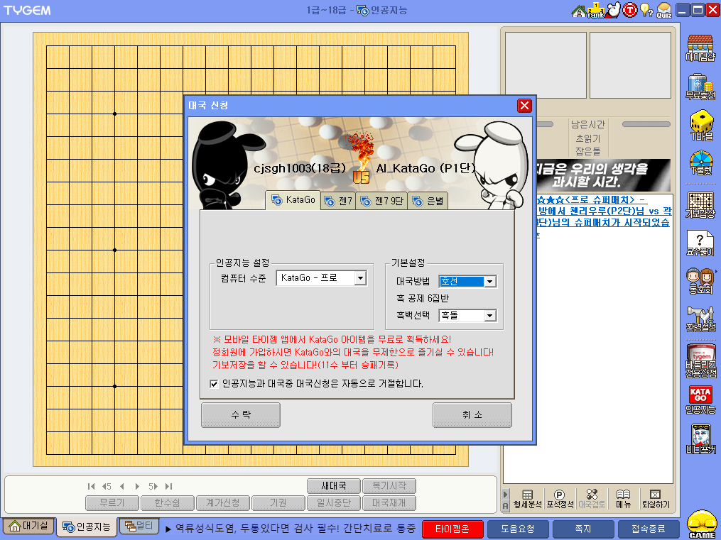 * 자동인사말 등록 : 원하는 대국인사말을 등록하면 대국시작 시 자동으로 인사말이 나옵니다.