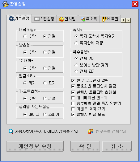 환경설정 - 대국에 전반적인 기능설정 및 인사말, 서버이동, 주소록 등을 등록/저장 할 수 있습니다.