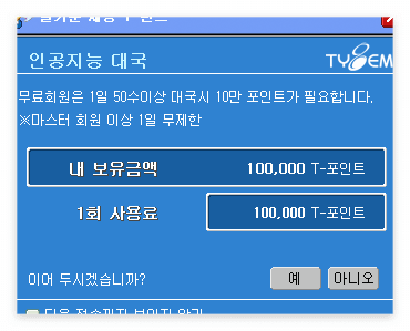 저는 은별이라는 인공 지능과 대국을 두었는데 50수 이상 대국을 누려면 10만 포인트가 필요하다고 합니다. 처음 주어지는 10만 포인트를 사용하면 더이상 둘 수 없는 것이 매우 아쉽습니다.