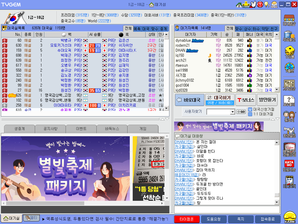 3. 처음 보내 되는 곳은 대기실입니다. 대기실에 입장하면 많은 사람들이 대국을 즐기고 있는 것을 볼 수 있습니다. 평일 낮 시간임에도 불구하고 1만명이 넘는 사람들이 접속하고 있습니다.