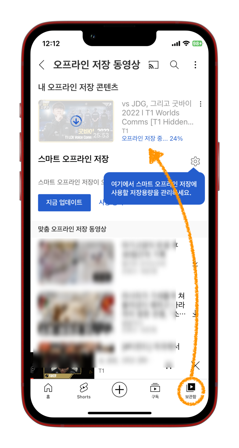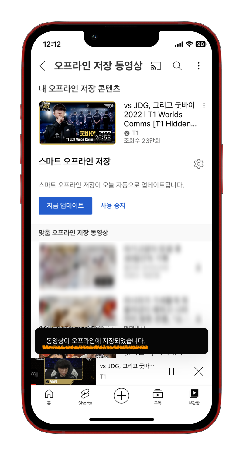 3️⃣ 보관함으로 이동하면 현재 몇 % 진행되었는지 알 수 있습니다. 잠시 기다리면 동영상이 오프라인에 저장되었다는 알람이 뜨게 돼요. 이제 비행기 모드를 켜고 다시 한번 유튜브 앱을 열어줍니다.