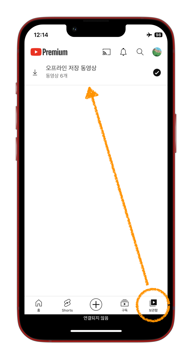 4️⃣ 우측 상단에 비행기모드가 켜진 게 보이죠? 이 상태에서 유튜브를 켜면 홈 화면에 내가 다운로드했던 콘텐츠가 보입니다. 그리고 보관함으로 이동하면 또 다른 영상도 시청이 가능합니다!