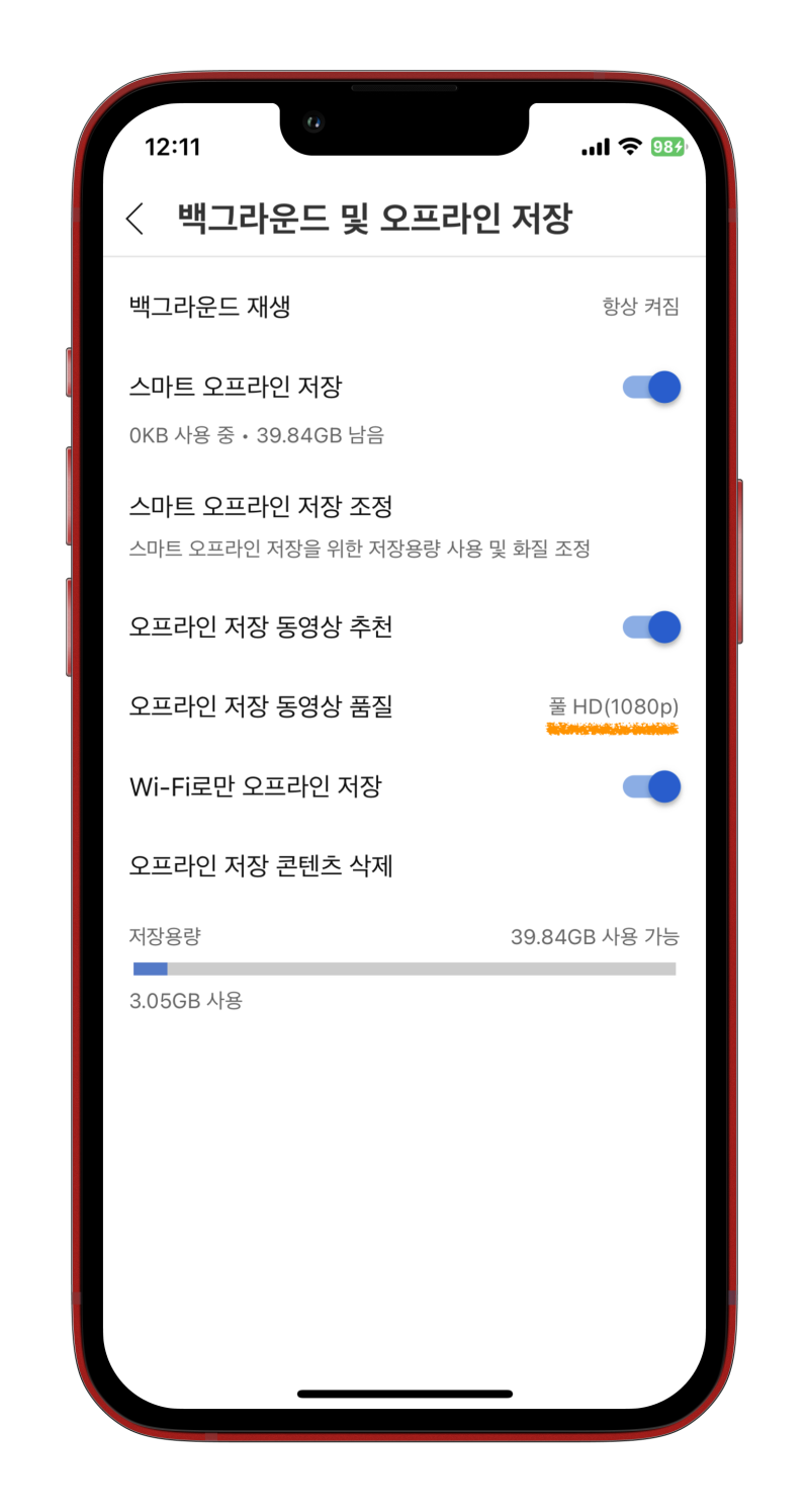 그리고 화질 바로 아래를 보면 Wi Fi로만 오프라인 저장 설정이 있으니, 이 부분도 한번 체크해 주세요. 데이터 연결 밖에 안되는 상황이라면 해당 설정을 끄고 다운로드해야 합니다.
